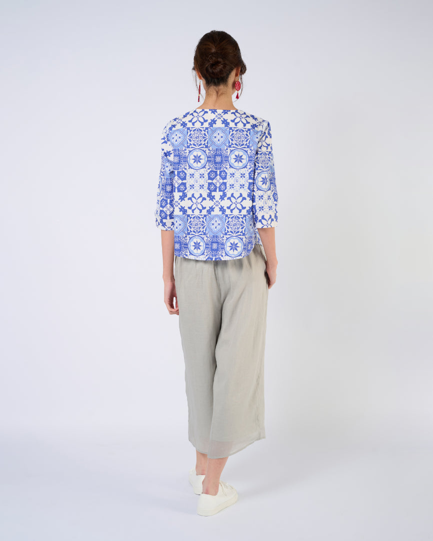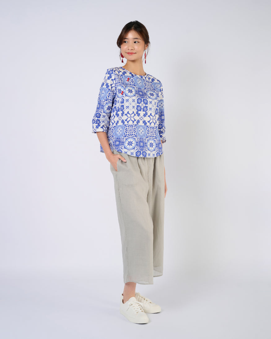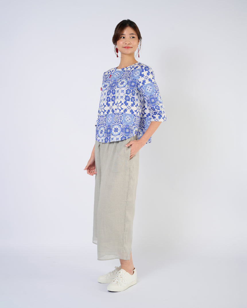 Featuring lovely blue tiles print on natural cotton. This modern cheongsam top features a simple cut of classic cheongsam front with colourful bead buttons. Round neck to provide maximum comfort. Loose fit and easy to wear.