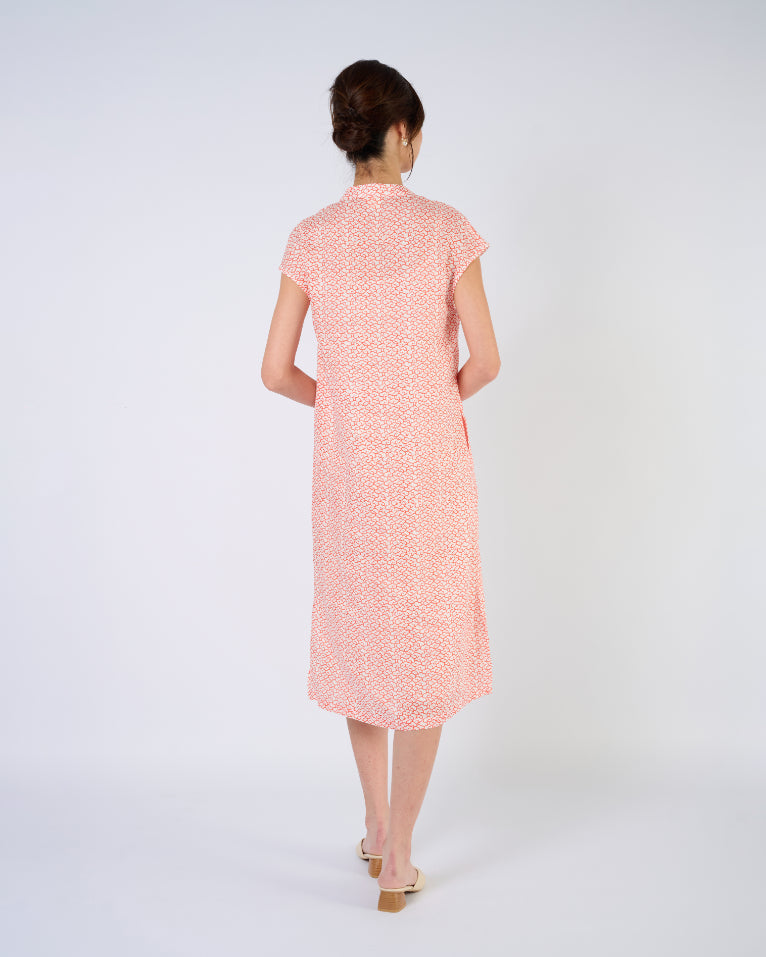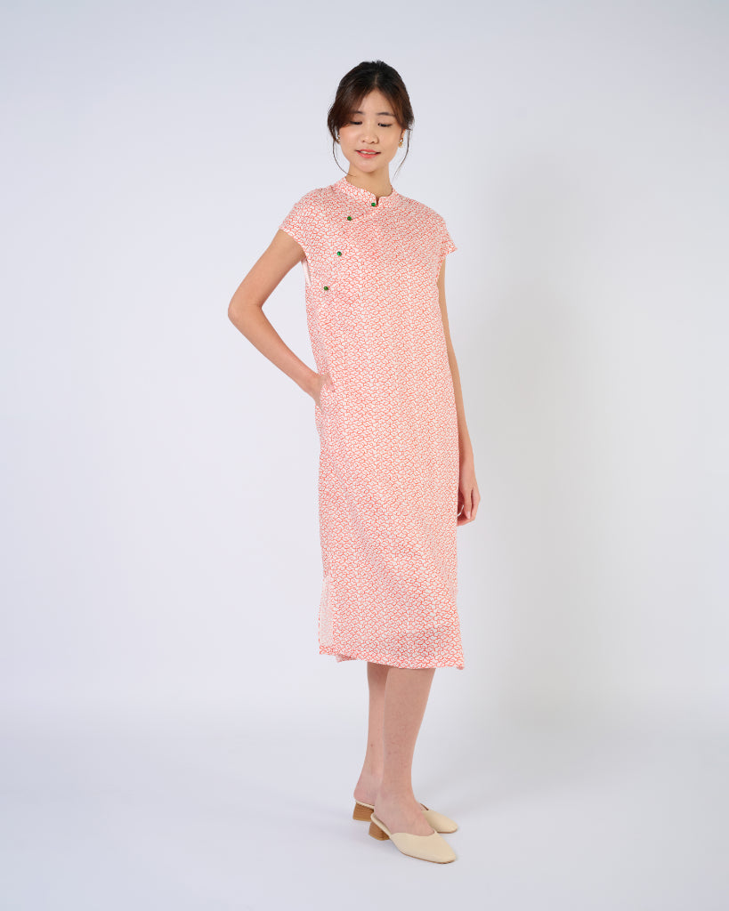 With a cap sleeve silhouette inspired by traditional cheongsam's popular in the 40's to 60's. This elegant dress features an A-line silhouette for maximum comfort, as well as a low mandarin collar with coloured buttons. It also features two side slits for easy of movement, as well as pockets! Features a modern red auspicious cloud print.