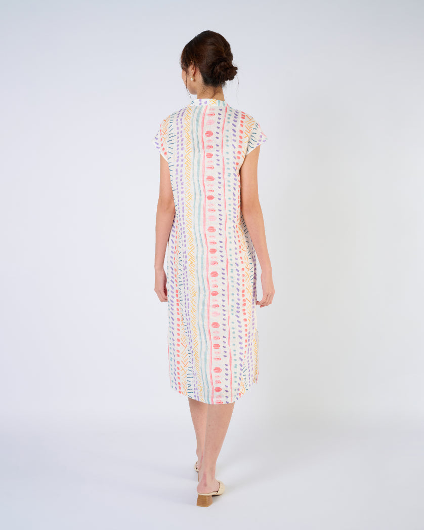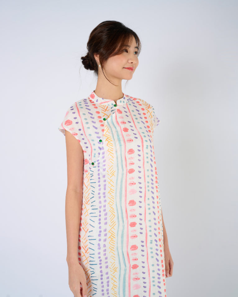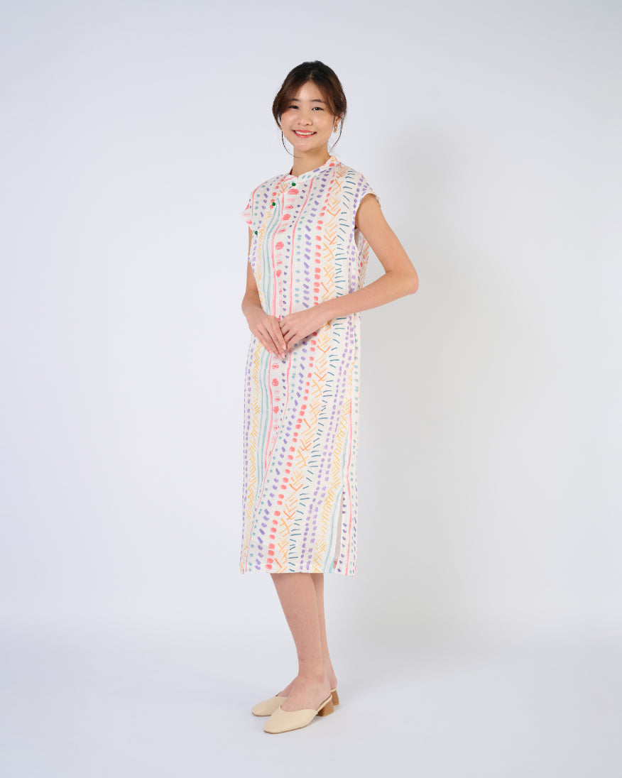 With a cap sleeve silhouette inspired by traditional cheongsam's popular in the 40's to 60's. This elegant dress features an A-line silhouette for maximum comfort, as well as a low mandarin collar with coloured buttons. It also features two side slits for easy of movement, as well as pockets! Features a modern multi colour geometric print.