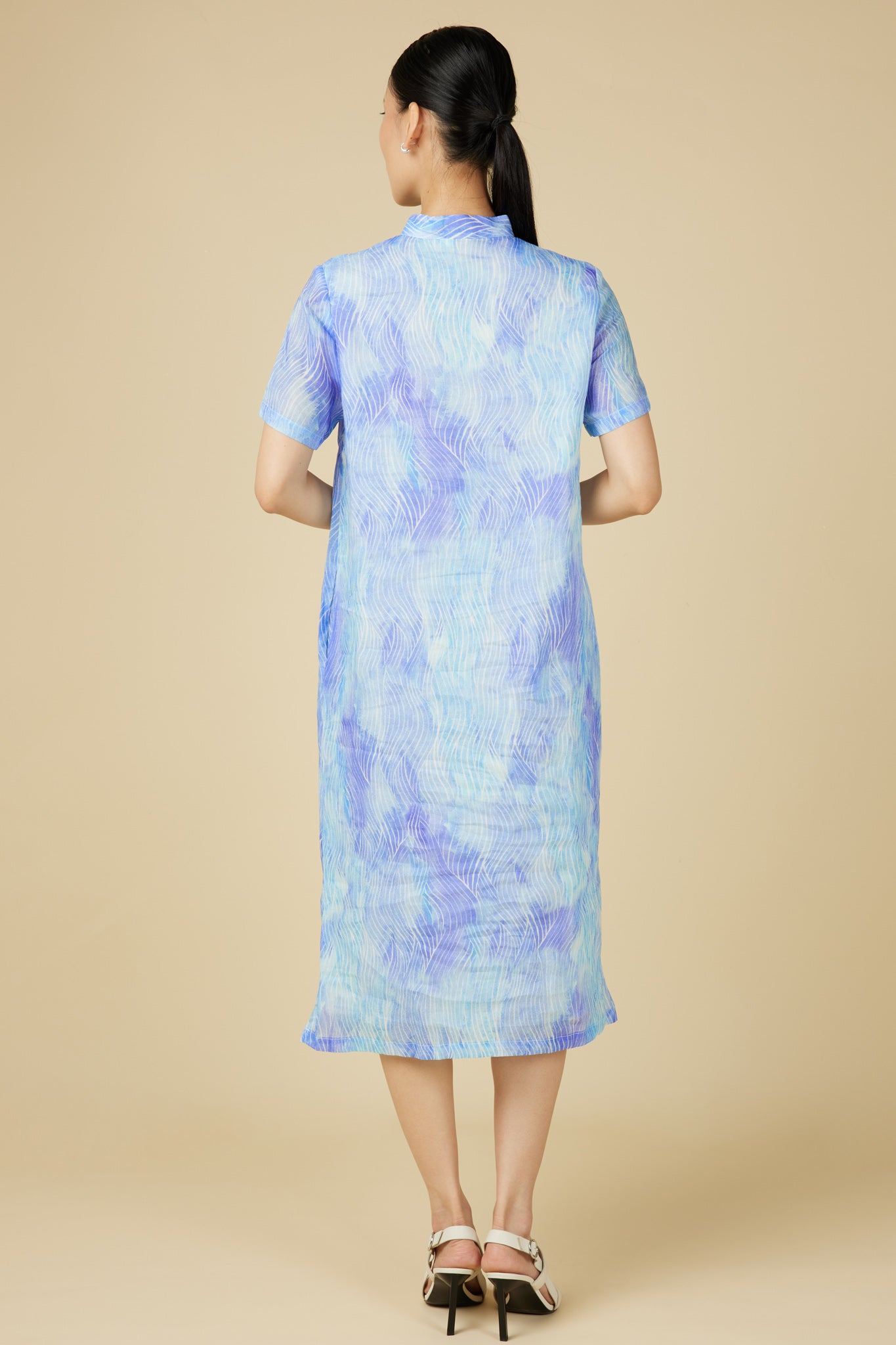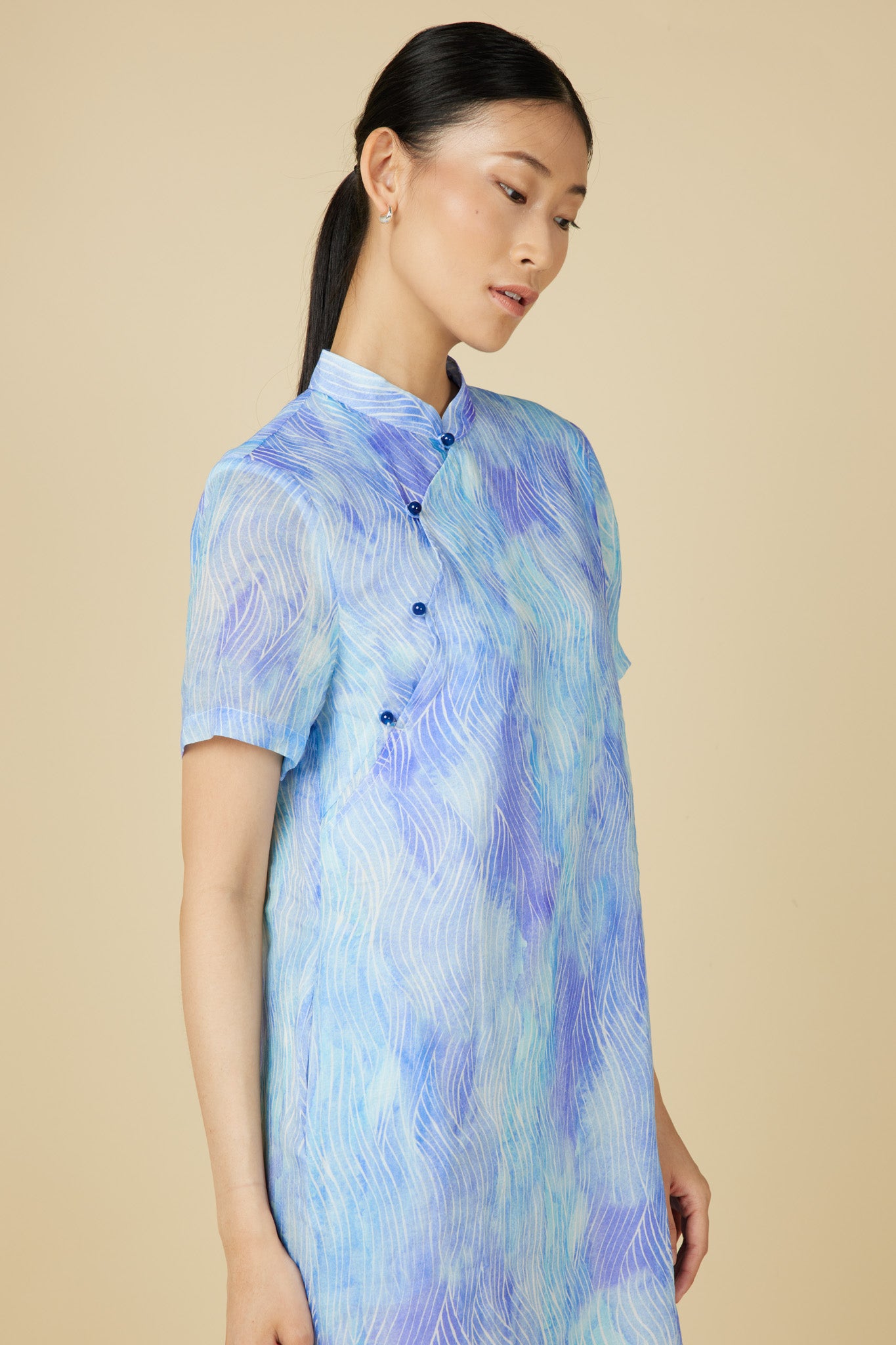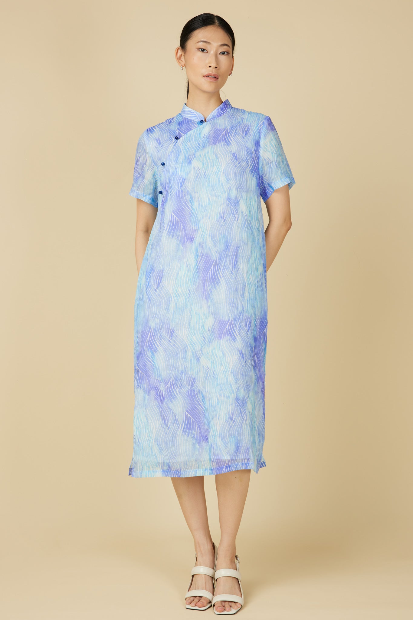 With a short sleeve silhouette inspired by traditional cheongsam's popular in the 40's to 60's. This elegant dress features an A-line silhouette for maximum comfort, as well as a low mandarin collar with natural coloured stone buttons. It also features two side slits for easy of movement, as well as pockets! Features a modern water colour abstract waves print.