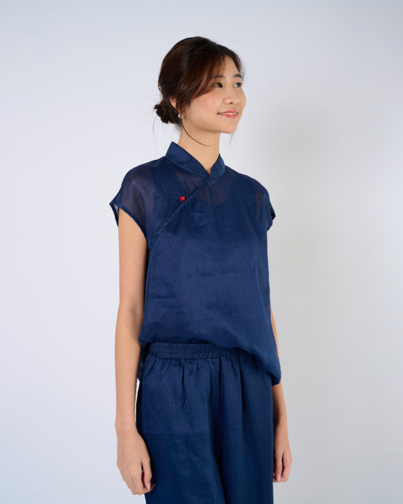 Cap Sleeve Ramie Cheongsam Top in Dark Blue