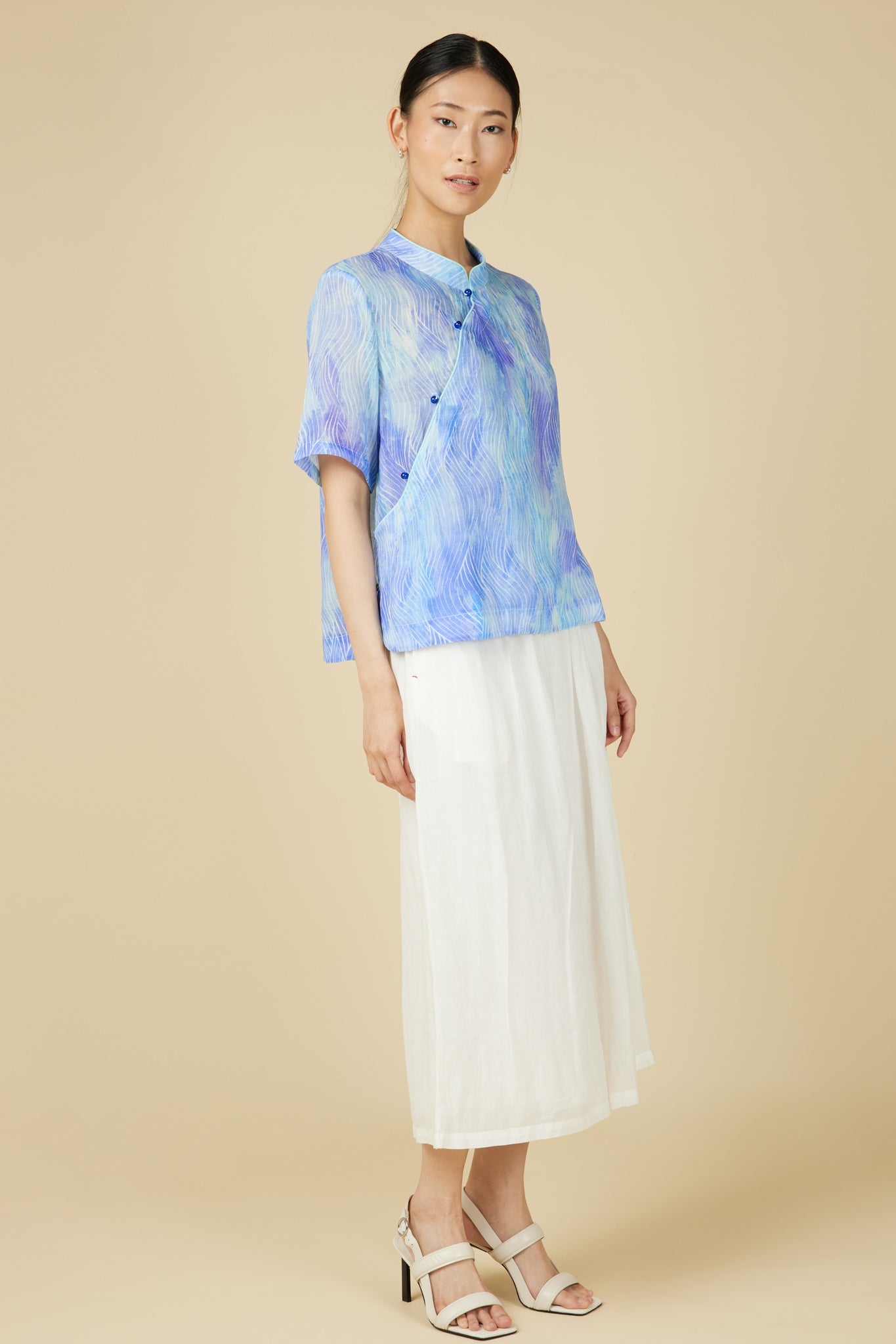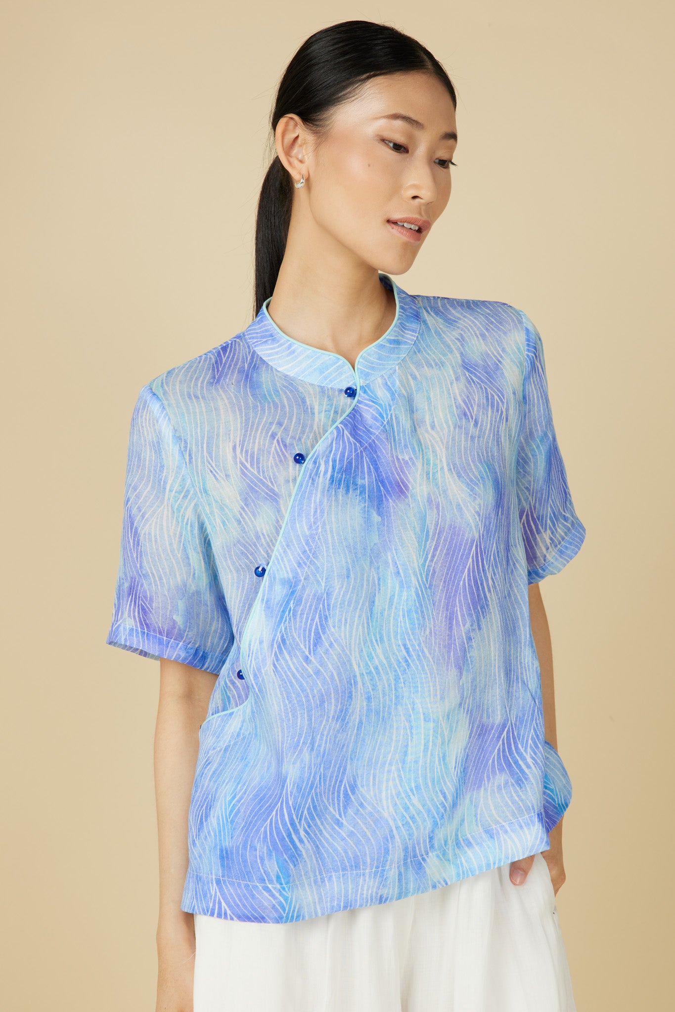 Short Sleeve Cheongsam Top - Abstract Waves