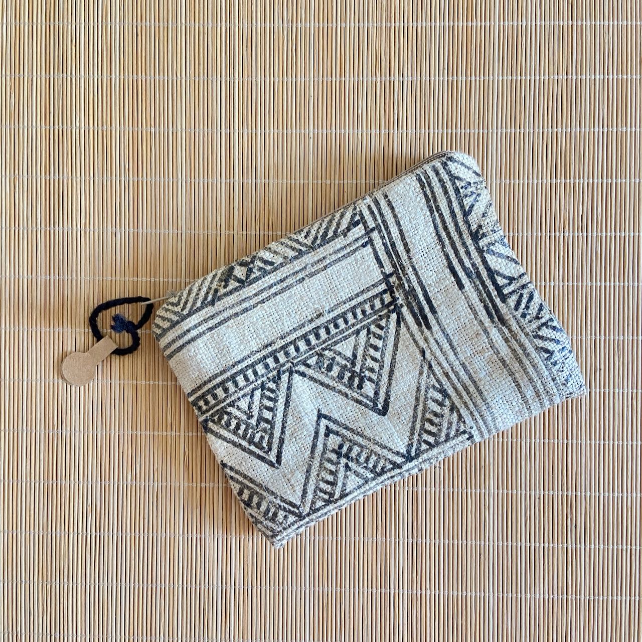 The pouch is made with traditional Laotian handwoven hemp batik fabric. This is a unique piece as the inner layer is made with handwoven cotton fabric with indigo dyed yarn.