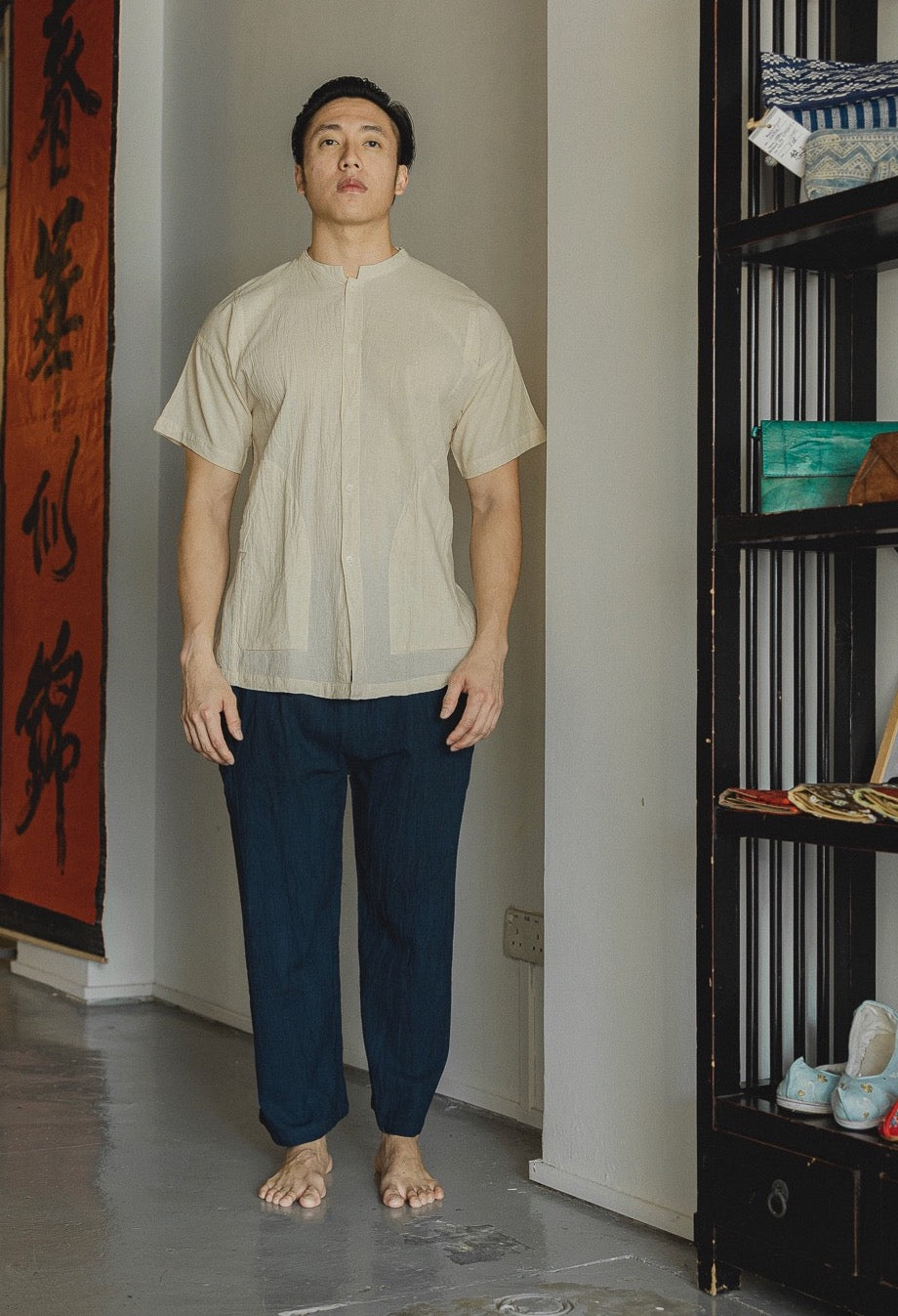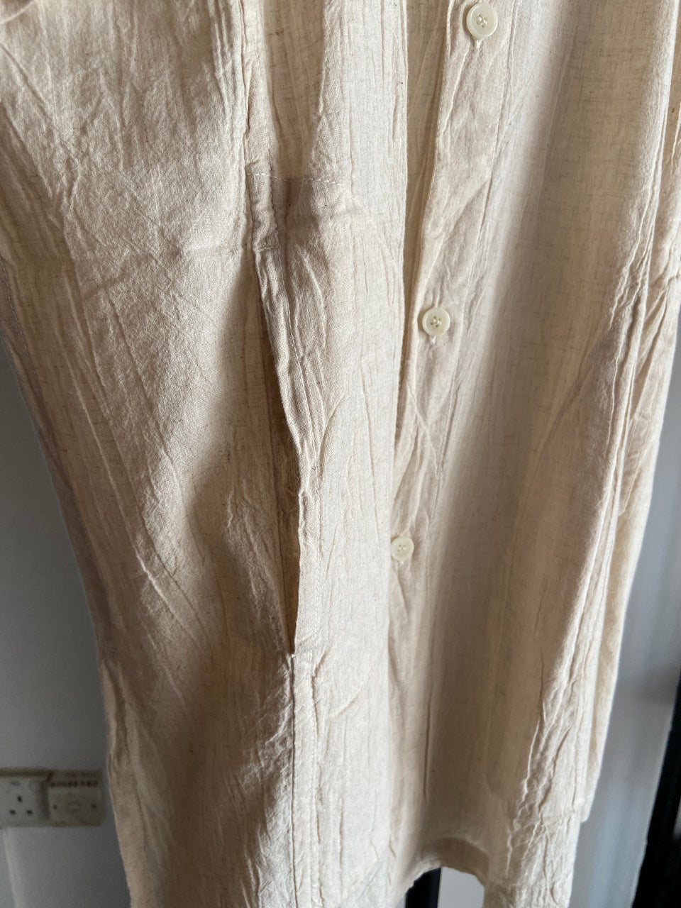 Hand-dyed Button shirt, minimalist design; thin and light cotton linen fabric. Square-end collar; button down centre front; two side slits; two front hidden pockets.