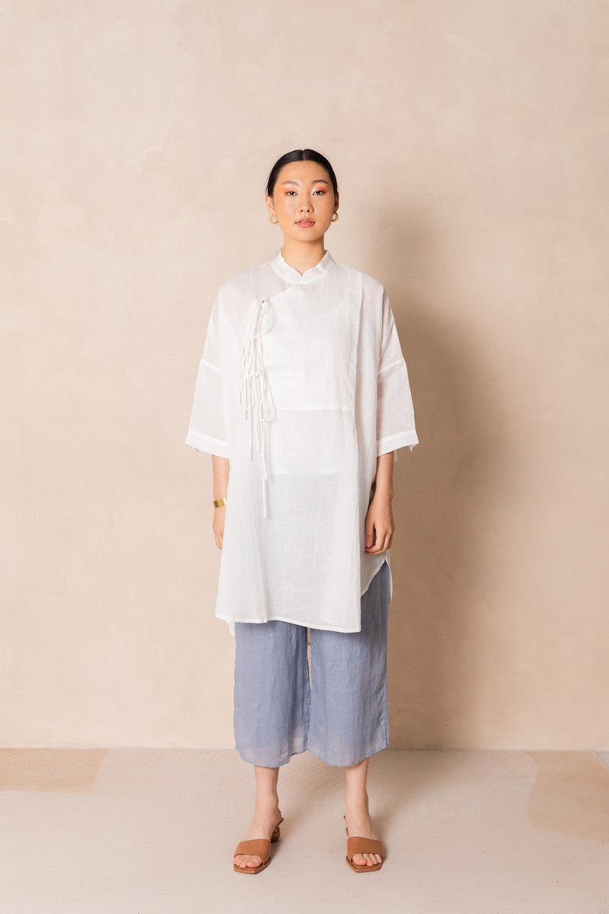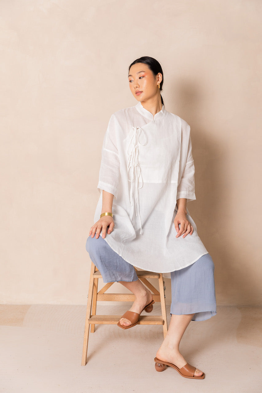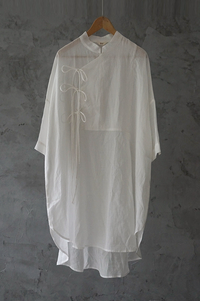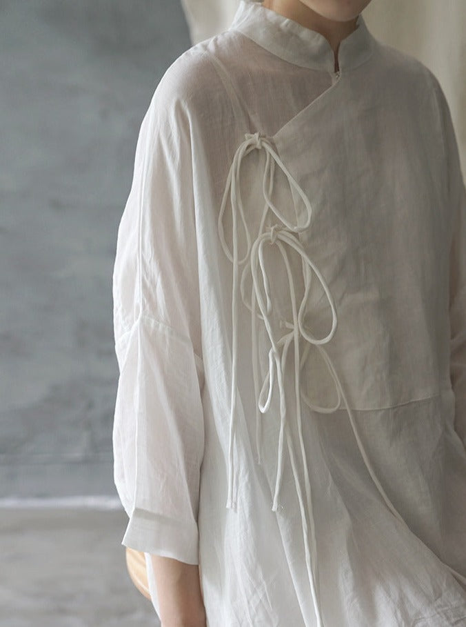 Elegant white Chinese collar long top. Unique ribbon-tied closure. Long sleeve.