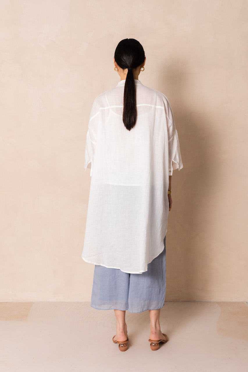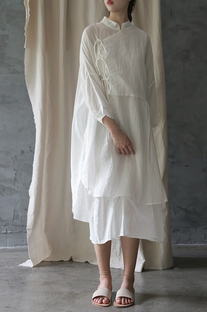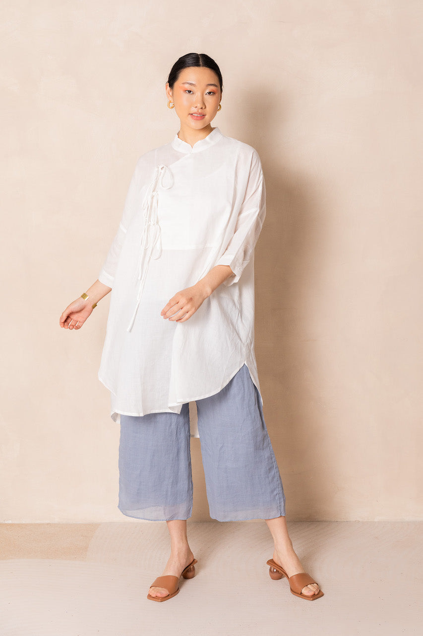 Elegant white Chinese collar long top. Unique ribbon-tied closure. Long sleeve.