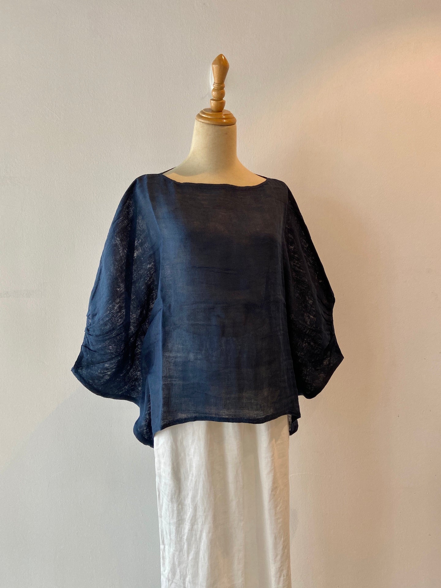 Feather light, with a soft, ballooning volume to match.  Cleverly pleated butterfly sleeves. With a boat neck (slipping on easily overhead), and may be worn over a simple singlet or layered with stretchy long sleeves underneath.
