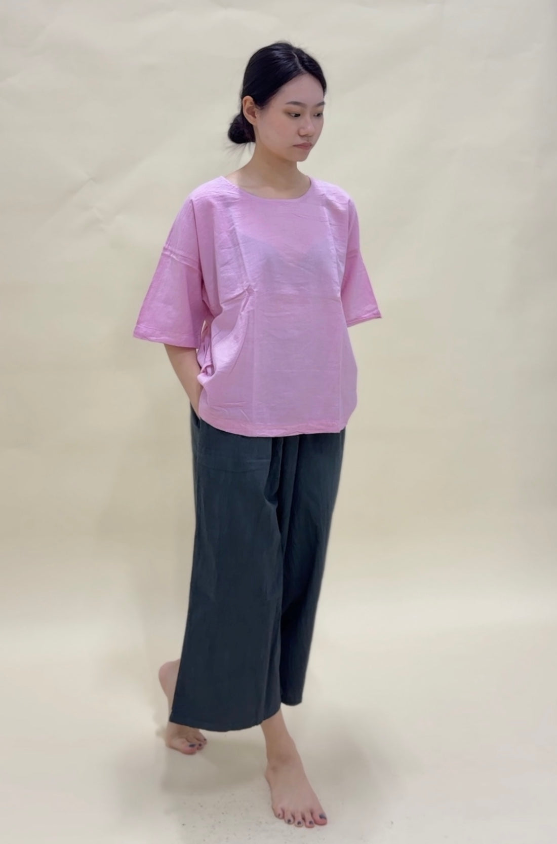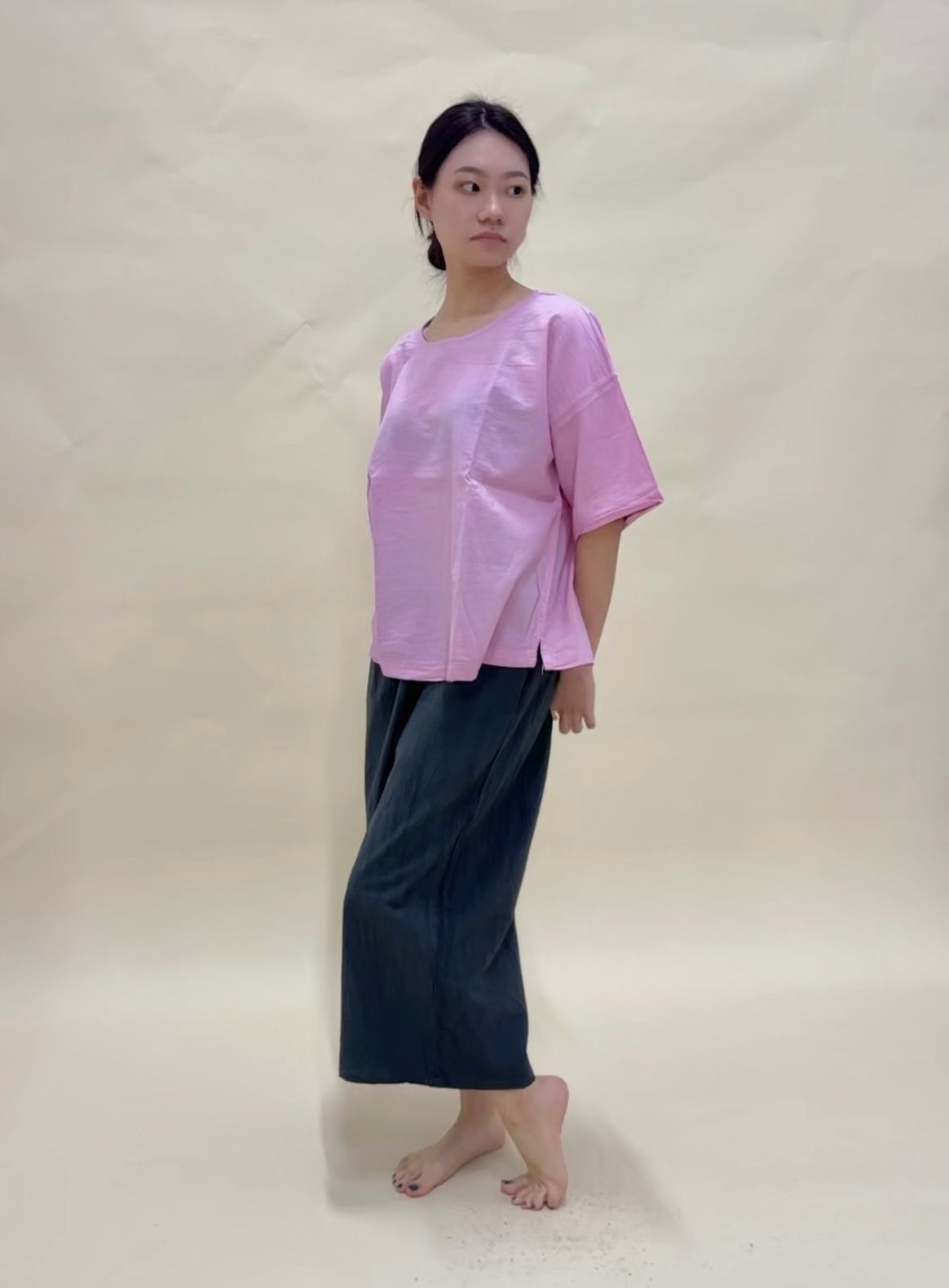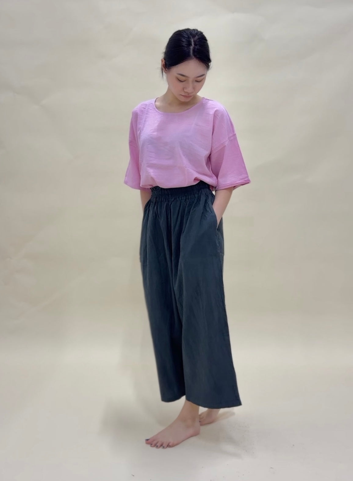 Unisex loose fitting long pants; elastic waistband; 2 side pockets.