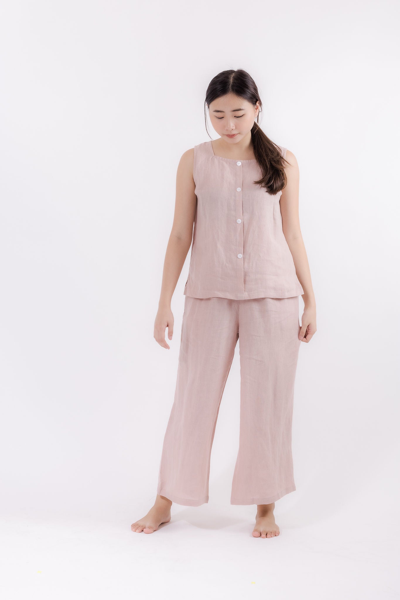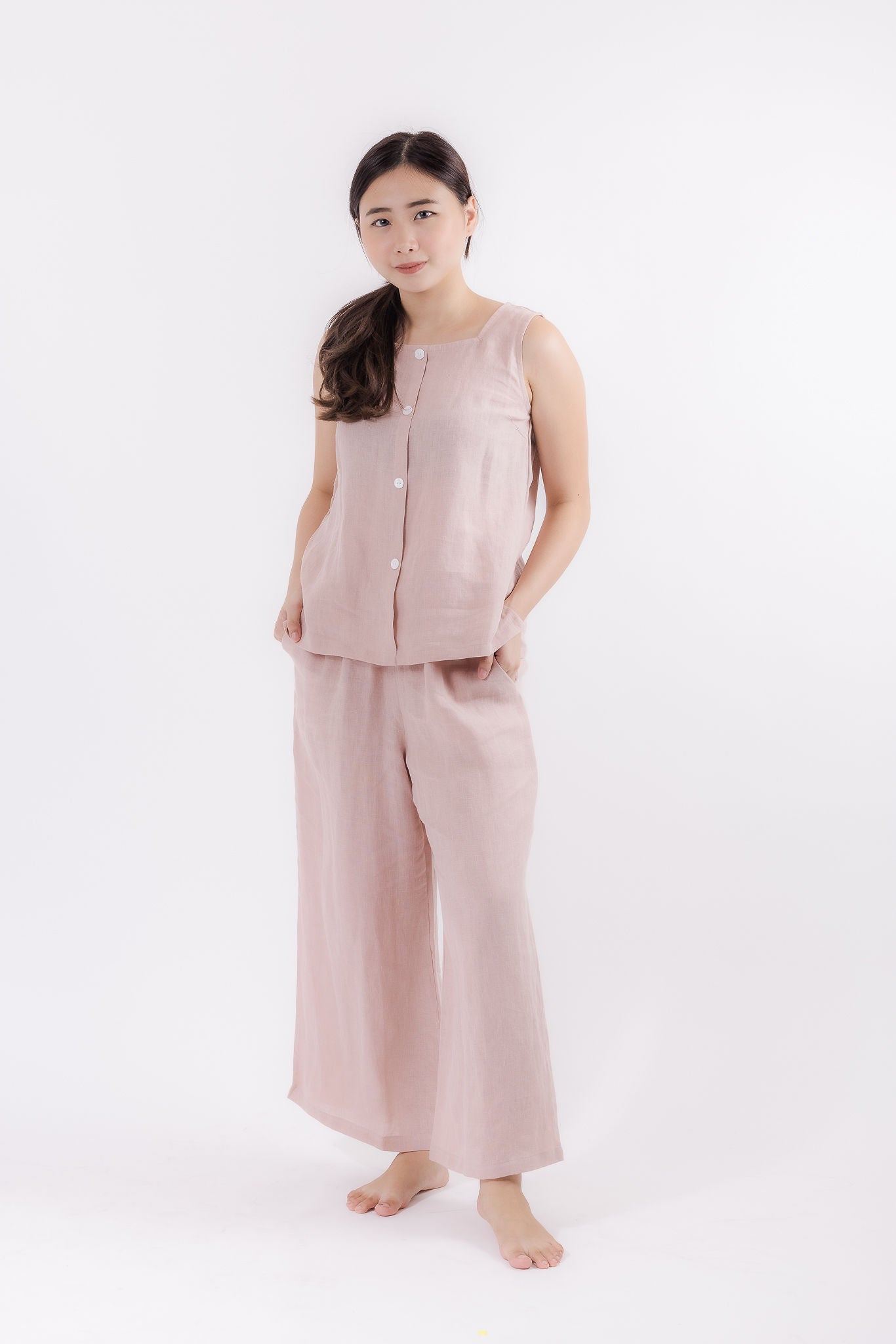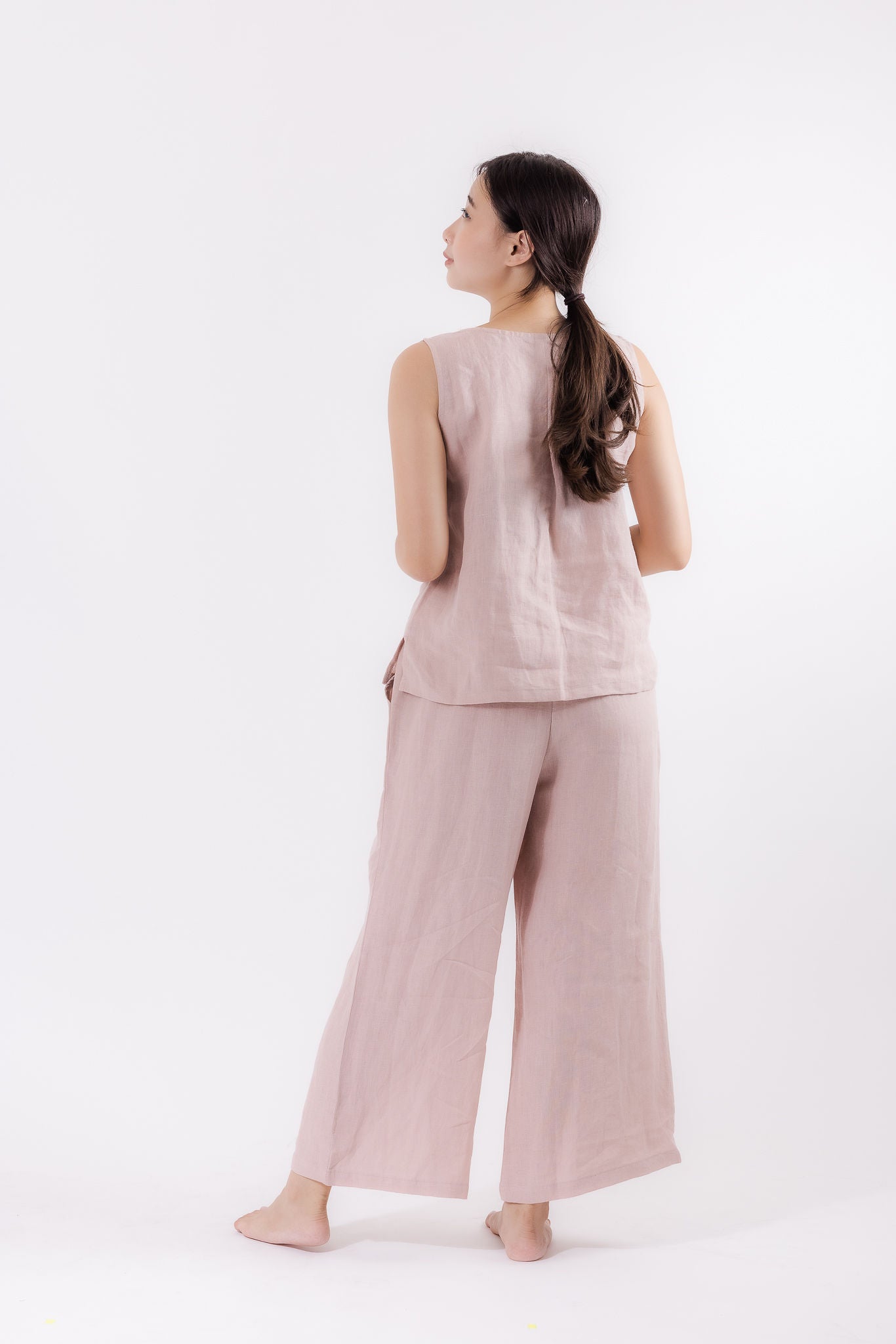 These wide leg linen pants in dusty pink are a classic wardrobe staple. Featuring a stretch waist band and two side pockets, pair yours with a simple top for an instant chic look. Our medium-weight linen loungewear is ideal for running errands to relaxing at home.