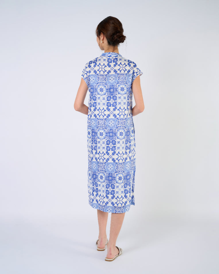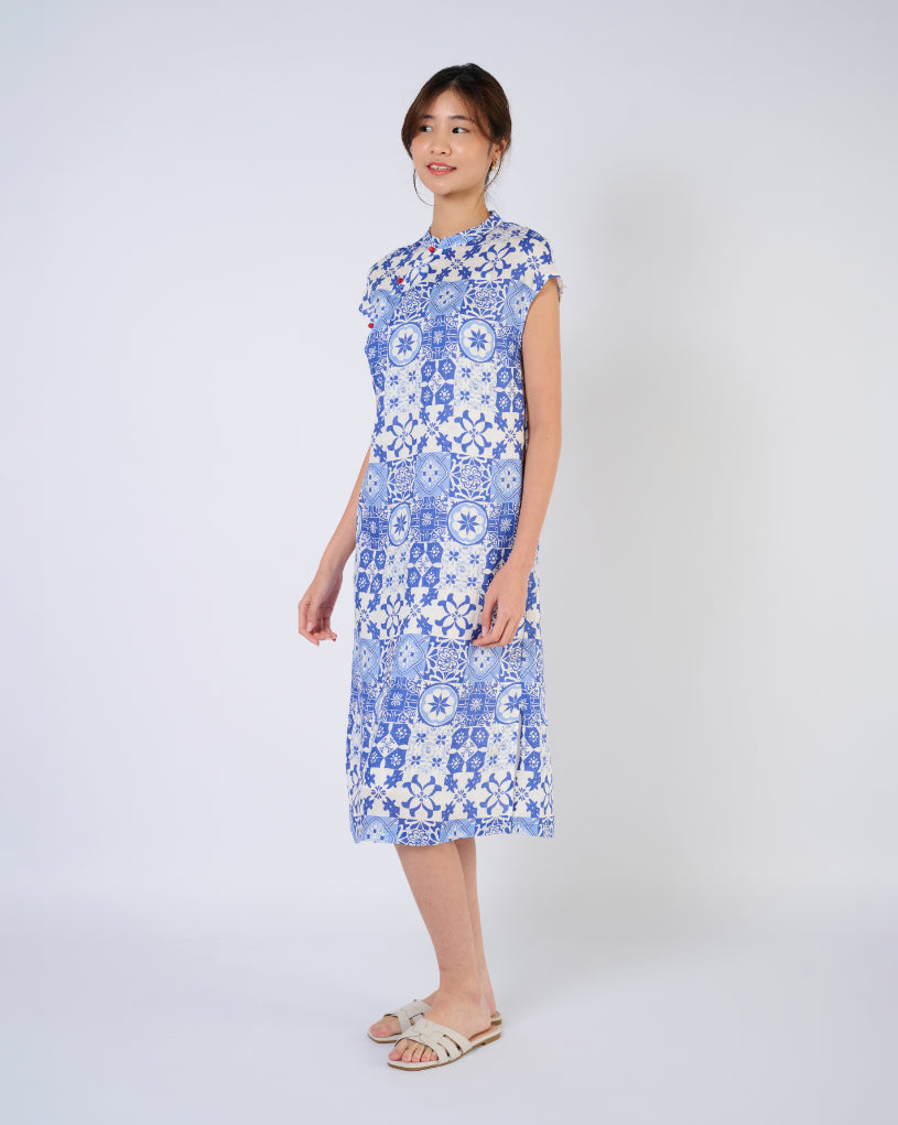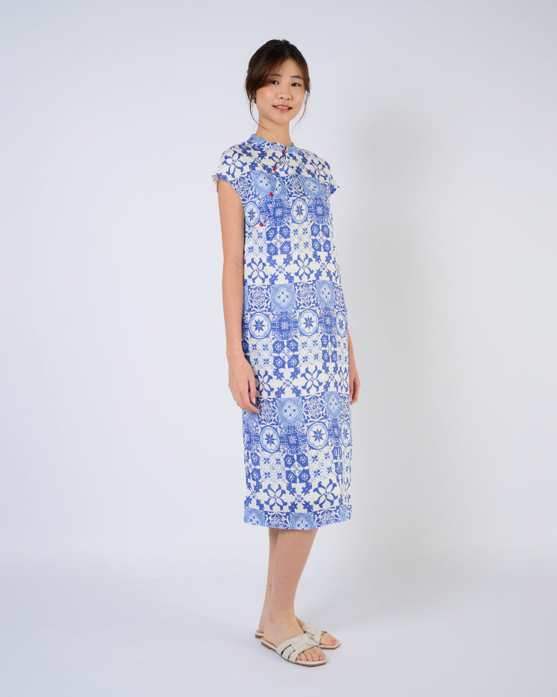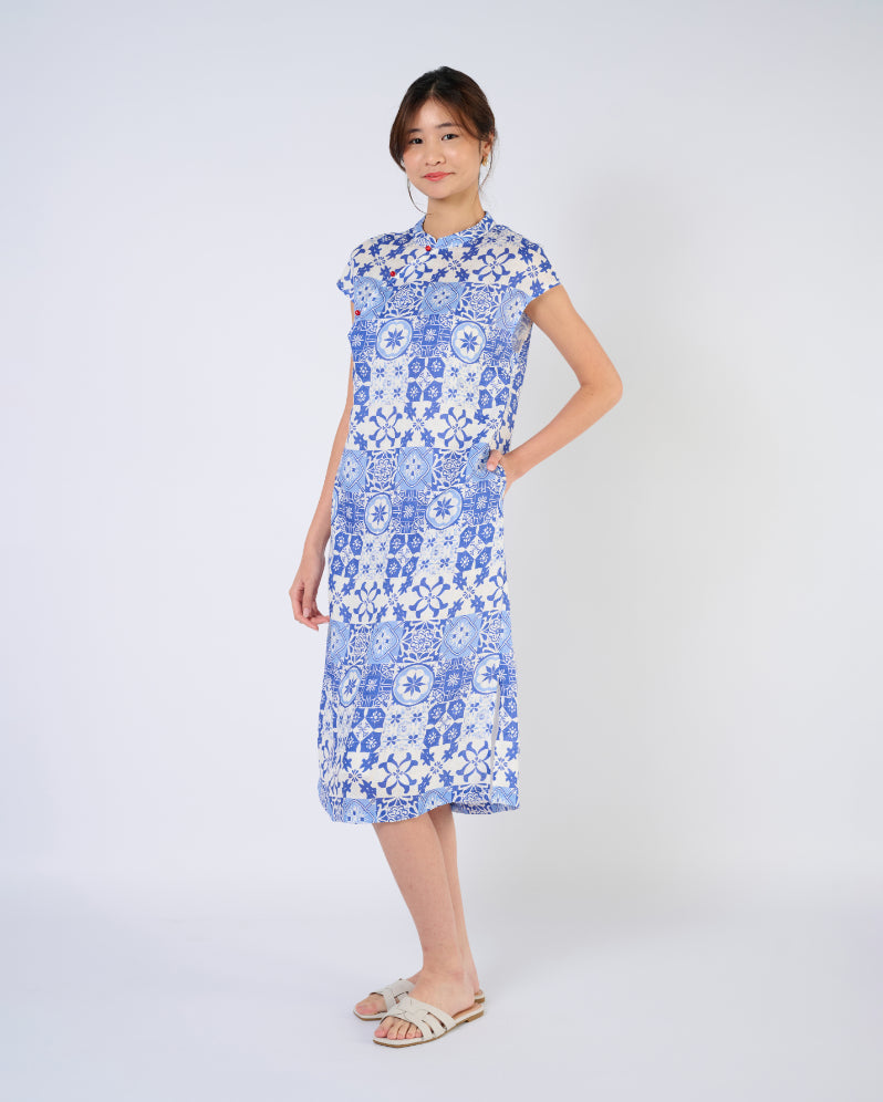 With a cap sleeve silhouette inspired by traditional cheongsam's popular in the 40's to 60's. This elegant dress features an A-line silhouette for maximum comfort, as well as a low mandarin collar with coloured buttons. It also features two side slits for easy of movement, as well as pockets! Features a modern blue tiles print.