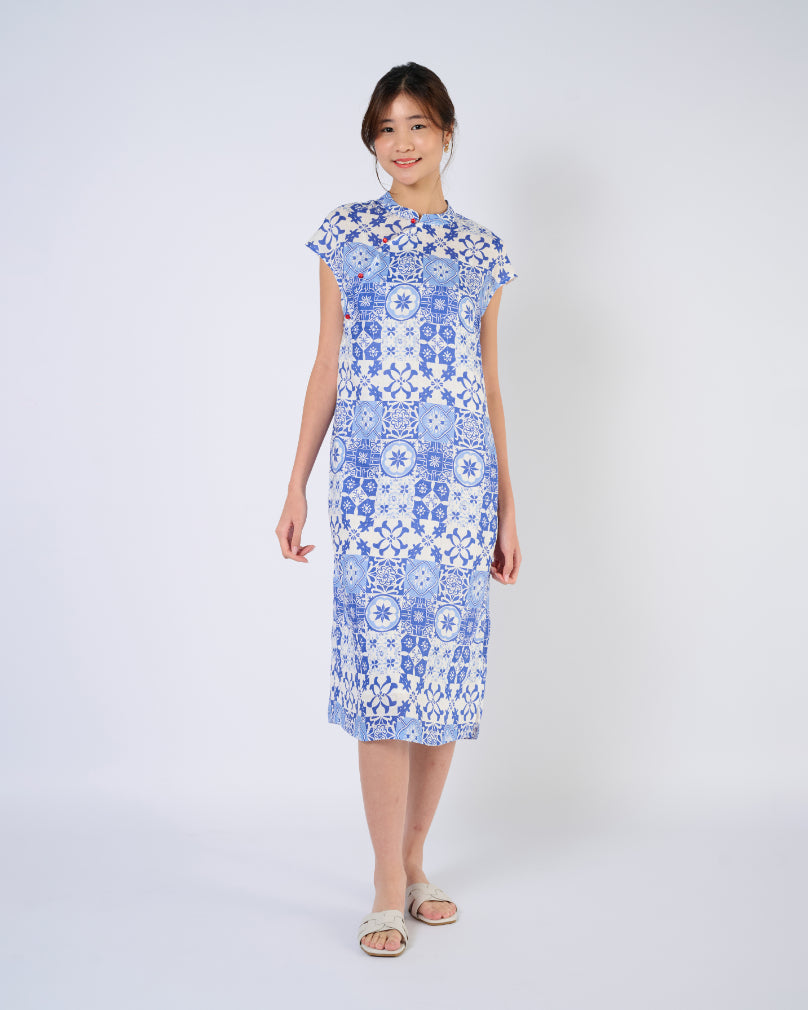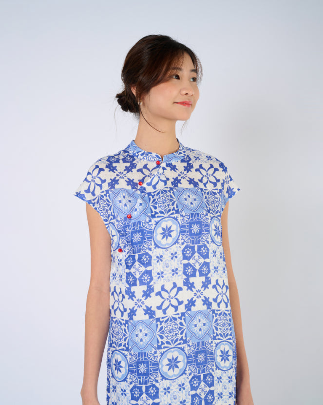 Cap Sleeve Cheongsam Dress in Blue Tiles