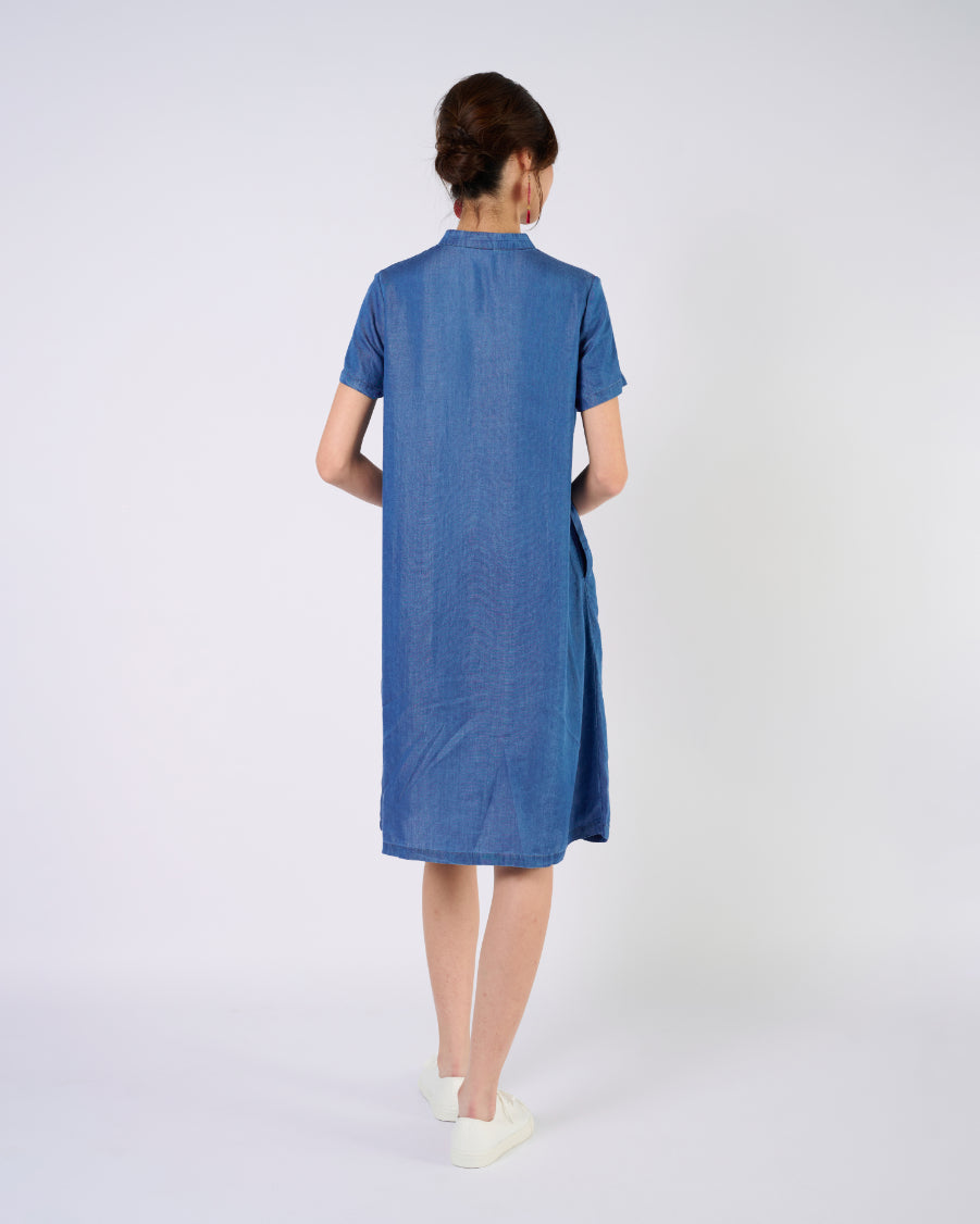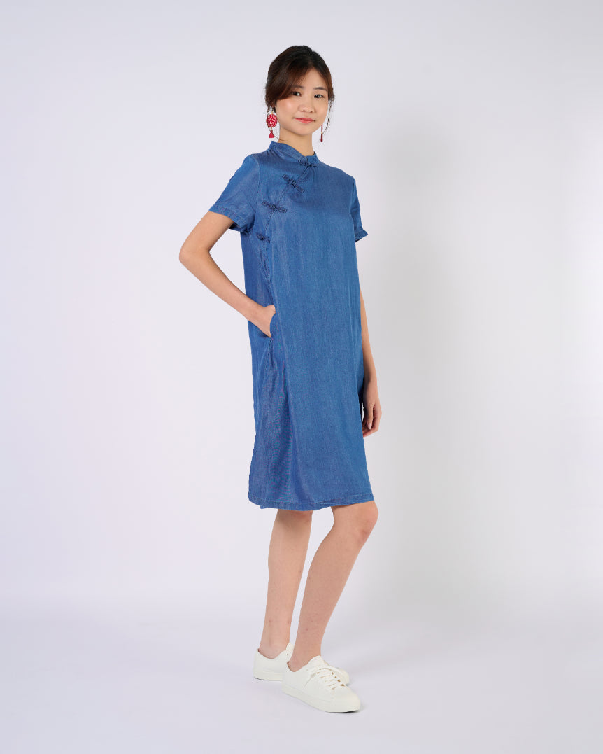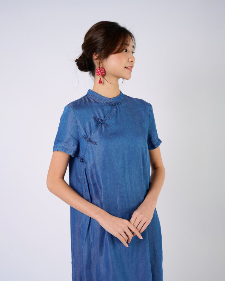 Cheongsam Midi Dress in Indigo Blue Jeans